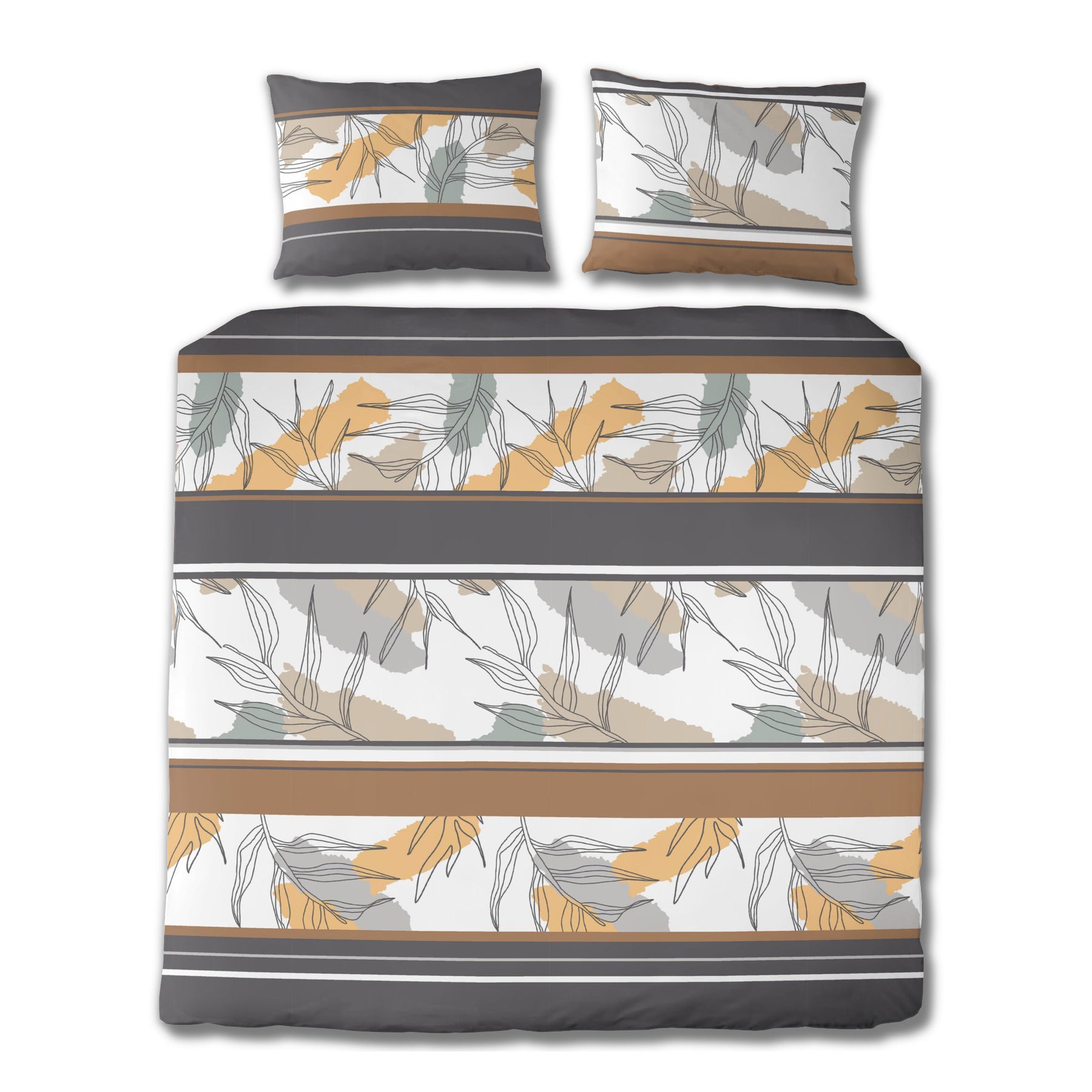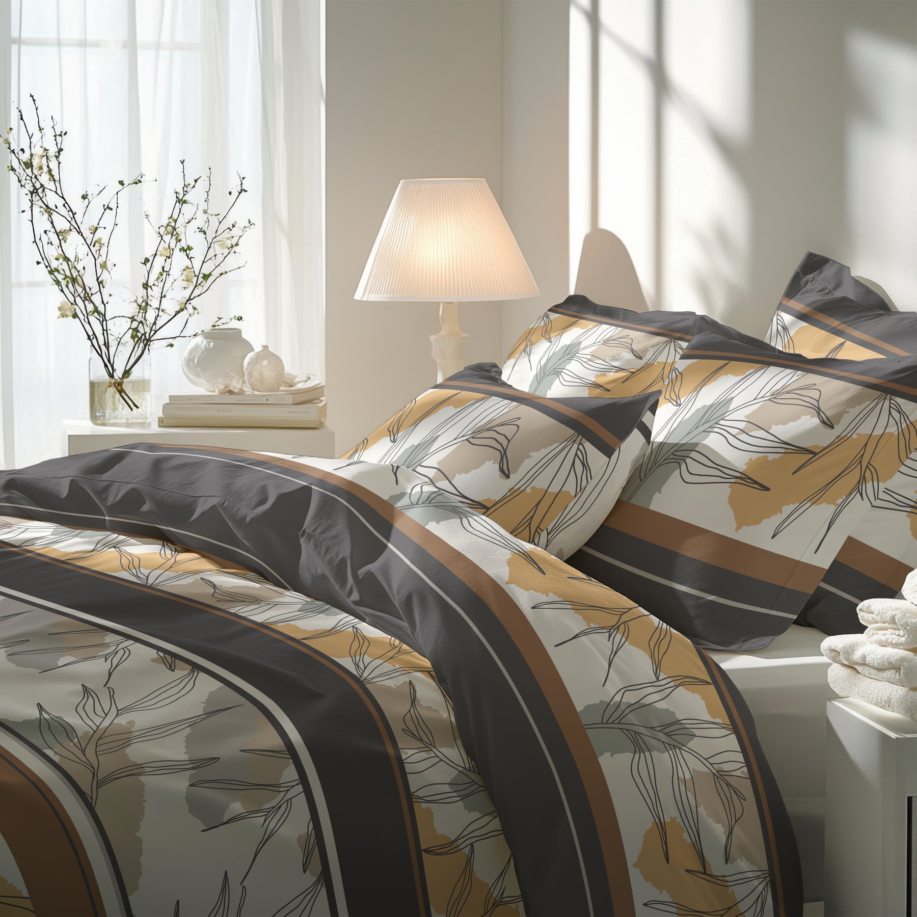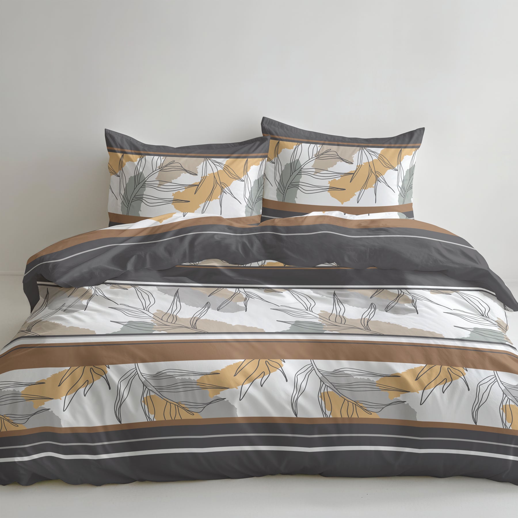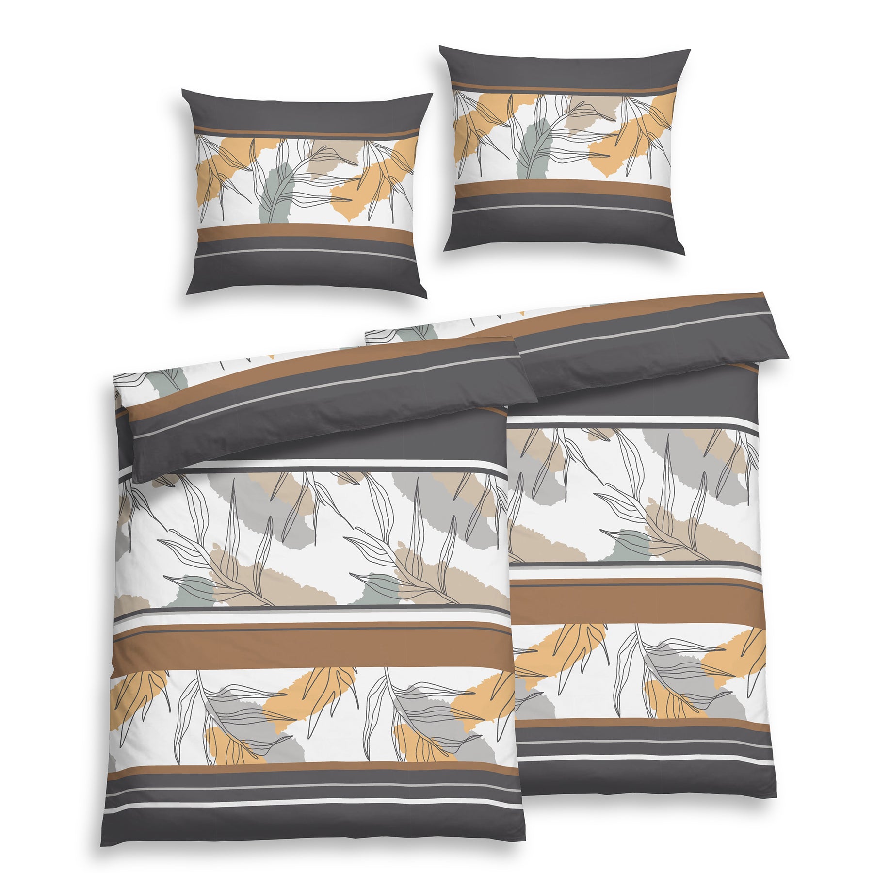 Manchmal ist es ein einziges Detail, das uns innehalten lässt. Diese Bettwäsche tut genau das – sie überrascht. Was auf den ersten Blick wie ein klassisches Streifenmuster wirkt, entfaltet beim zweiten Hinsehen eine Tiefe, die berührt. Die kraftvollen Streifensegmente in edlem Anthrazit und warmem Goldbraun strahlen Ruhe aus – und doch ist da diese Spannung, die das Auge fesselt und die Gedanken in Bewegung bringt.