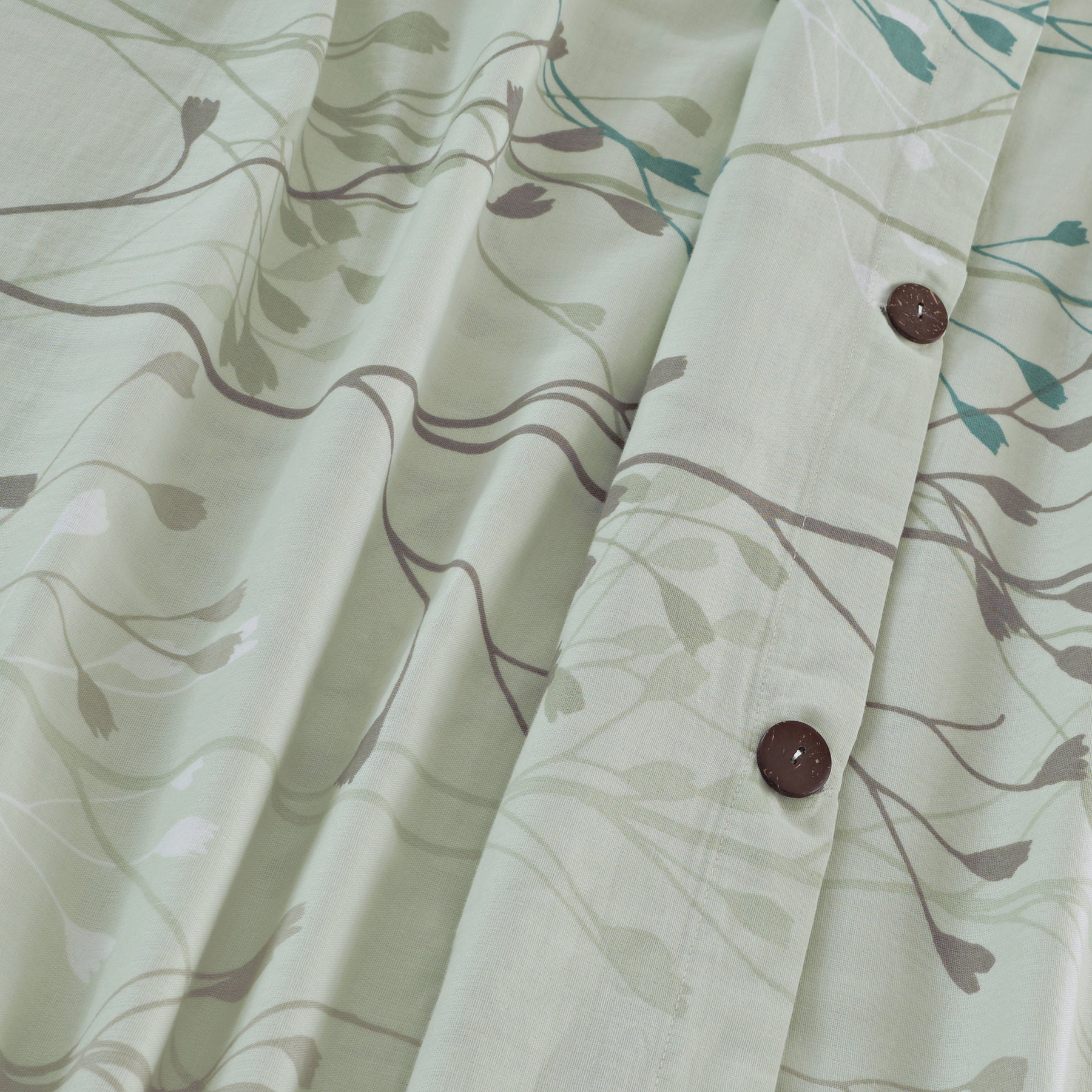 Feine, filigrane Gräser in hellen Naturtönen ziehen sich luftig über das Design und wirken, als hätten sie sich sanft im Wind bewegt. Der Verschluss mit naturfarbenen Kokosknöpfen unterstreicht die natürliche Ausstrahlung.