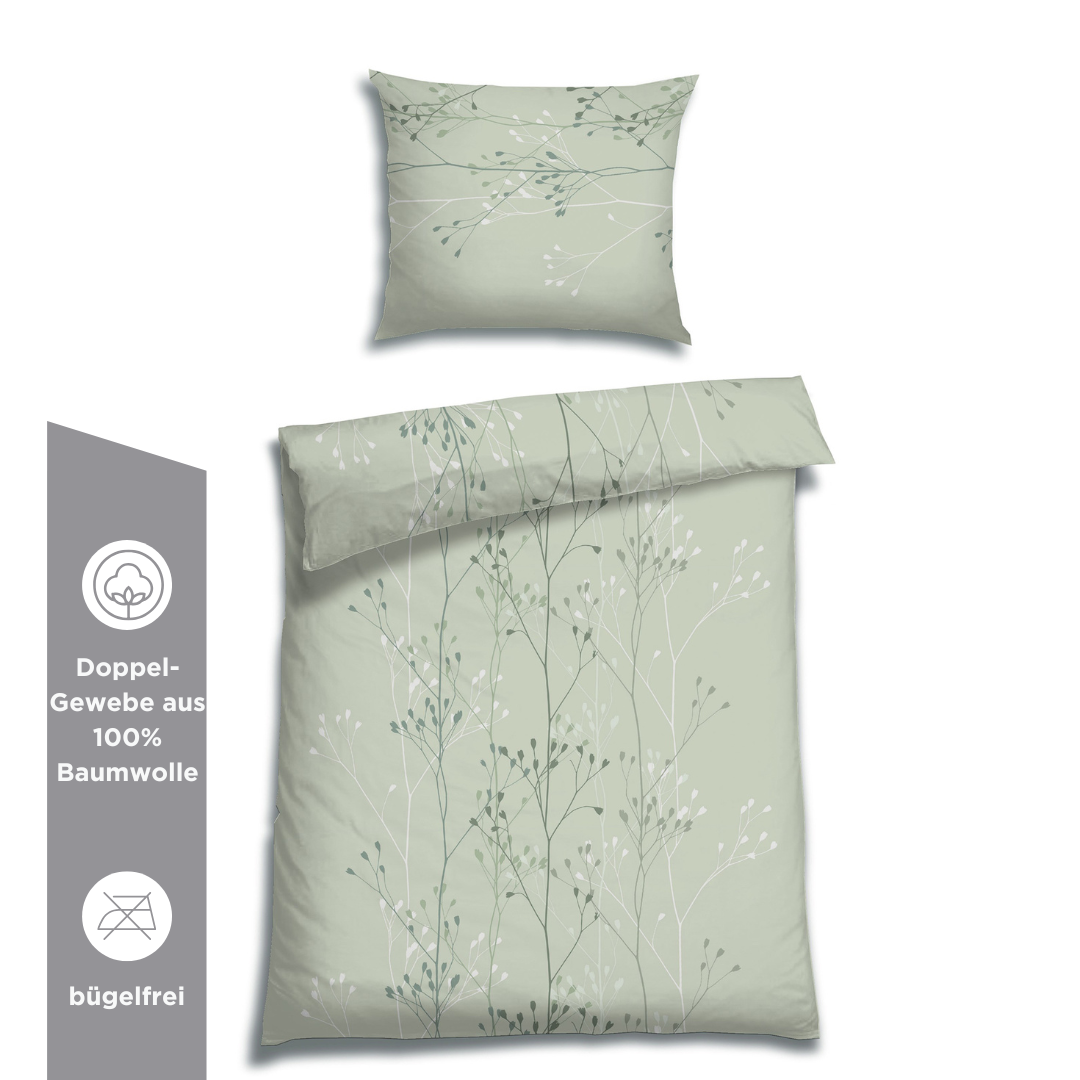 Wie eine Sommerwiese in Salbei erzählt dieses Bettwäsche-Design von ruhigen Sommertagen und frischer Natur. Die zarte salbeigrüne Grundfarbe erinnert an die ersten Sonnenstrahlen am Morgen und vermittelt Ruhe, Leichtigkeit und ein Gefühl klarer Sommerluft.