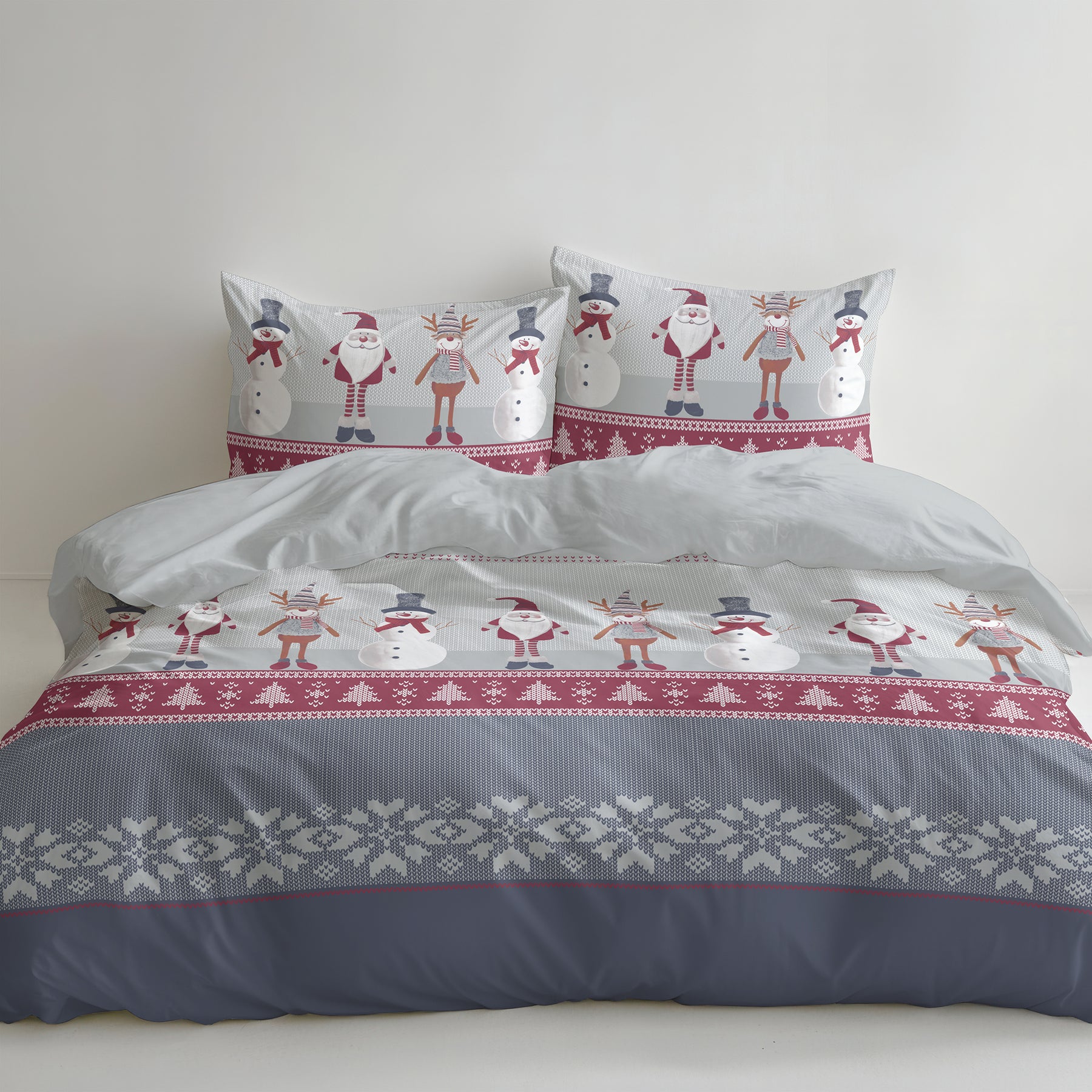 Schick in Strick mit Augenzwinkern: Schneemann, Hirsch und Weihnachtsmann stehen Spalier, um dich fröhlich durch die Weihnachtszeit zu begleiten. Ein Design, dass einfach nur Gemütlichkeit und gute Laune verbreitet. Die Strickstruktur erinnert an die Lieblingssocken von Oma und die Figuren strahlen einen Touch Weihnachtsnostalgie aus. Dennoch ist das Design durch die elegante Farbgebung in Rauchblau, Silber und Bordo-Rot nicht allzu weihnachtlich und kann somit ruhig schon zu Adventbeginn Stimmung in Ihr Schlafzimmer bringen. Und wer weiß, vielleicht gibt es ja noch ein wenig Wichtel-Schabernack obendrauf?
