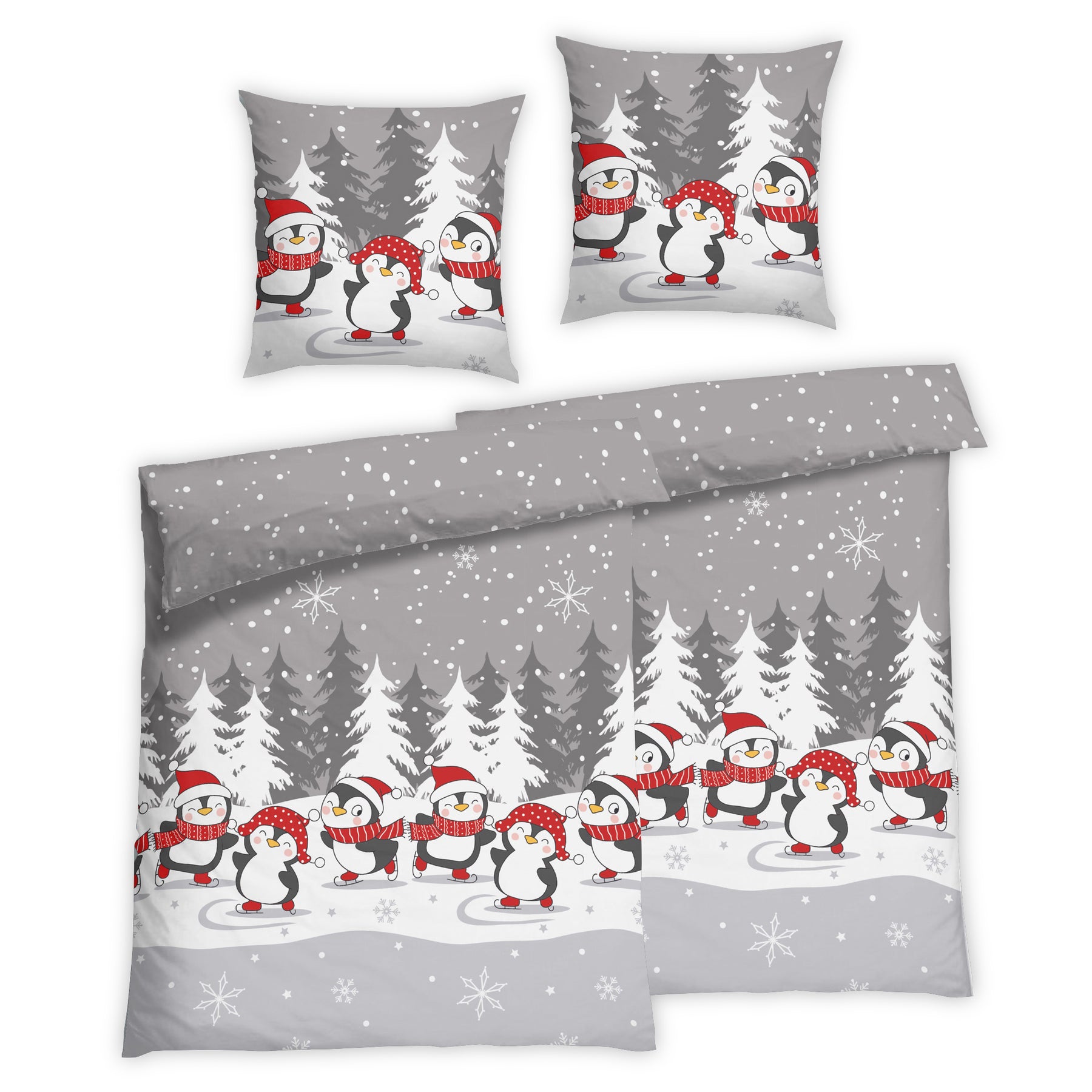 Diese Bettwäsche versprüht pure Freude: Fröhliche Pinguine tummeln sich vergnügt auf dem Eis, eingebettet in eine malerische Winterlandschaft mit detailreich gestalteten Schneeflocken. Die leuchtend roten Mützen, Schals und Schlittschuhe der Pinguine setzen einen lebhaften Akzent, der die ruhige Winterkulisse auf charmante Weise belebt. Ihre rosigen Wangen und orangefarbenen Schnäbel verstärken die fröhliche Atmosphäre zusätzlich. So macht der Winter richtig Spaß!