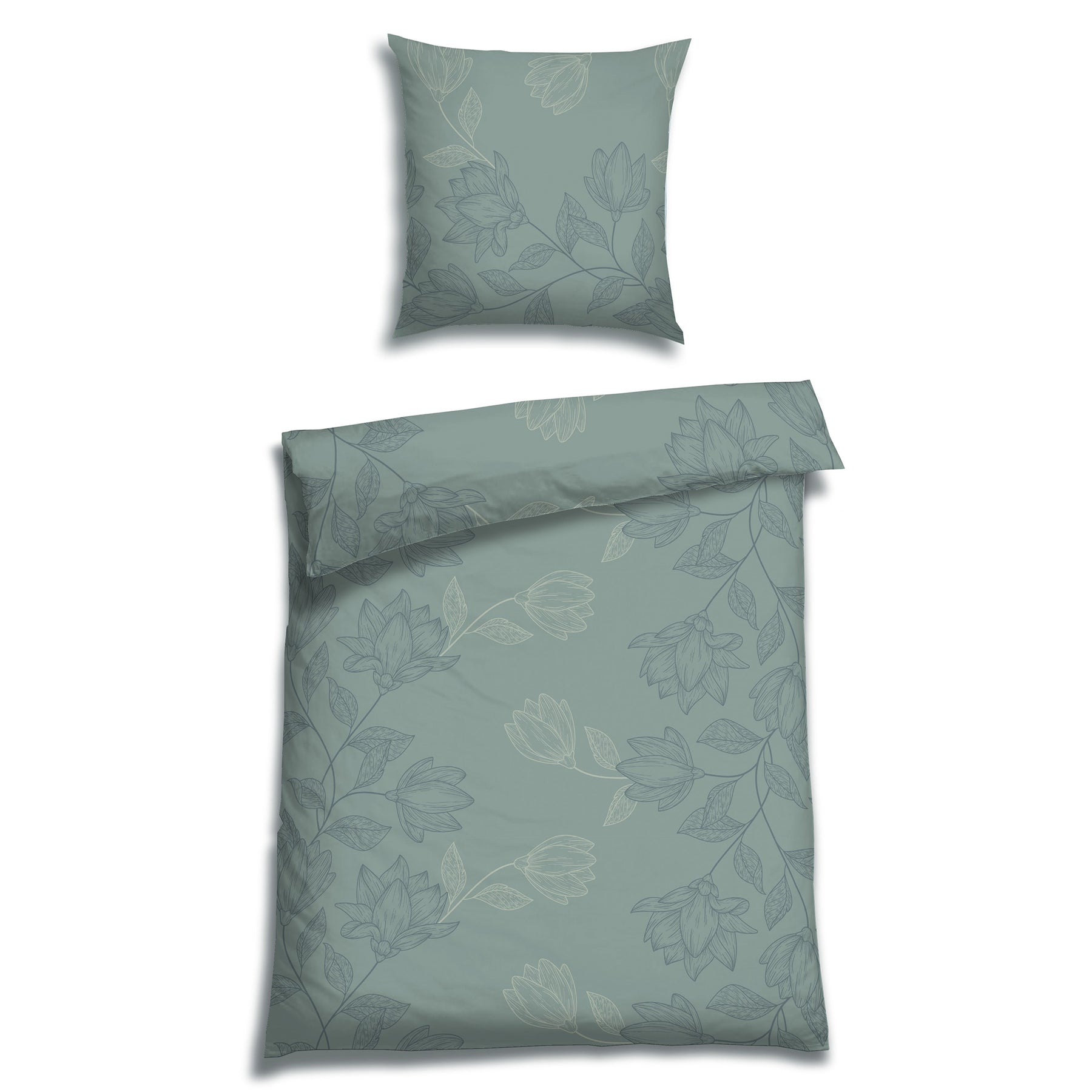 • zartes, stilvolles Blumendesign in ruhiger Farbgebung in Graugrün, Petrol und gebrochenem Lindgrün