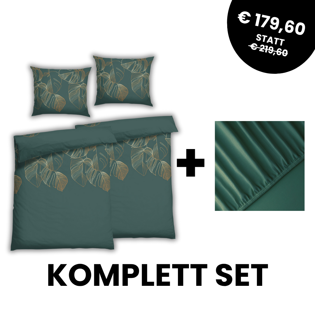 Das Komplett Set besteht aus 1x Doppelpack Bettwäsche 140x200cm und der Wahl zwischen 2x 90x200cm oder 1x 180x200cm der Spannbetttücher.