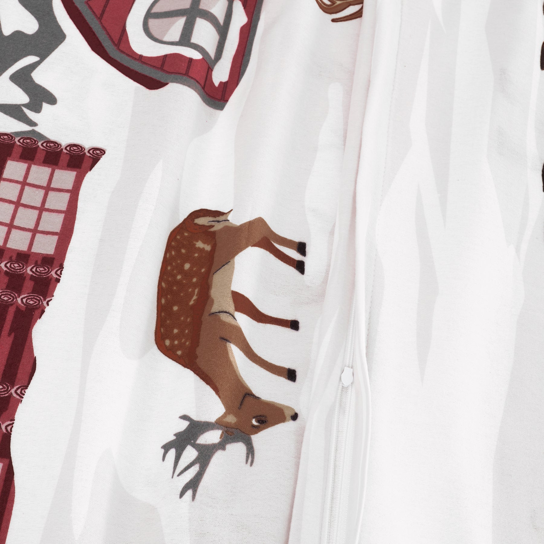 Die Märchenwelt Walt Disneys lässt grüßen: Der charmante Reiz zwischen realistischer und zeichentrickartiger Gestaltung dieses bezaubernden Winterdesigns entführt in eine verträumte Winterlandschaft der Berge. Das stolze und doch zugleich sanfte Antlitz des Hirsches im Vordergrund, das Rentier, das friedlich den Schnee durchstöbert und die gemütlich verschneiten Holzhäuser in warmen Rottönen bilden eine besondere Atmosphäre, die zum Kuscheln und Träumen einlädt. Die Kombination der Rot- und Brauntöne mit den Grautönen auf klarem Weiß erzeugt eine klare und gleichzeitig gemütlich anmutende Stimmung.